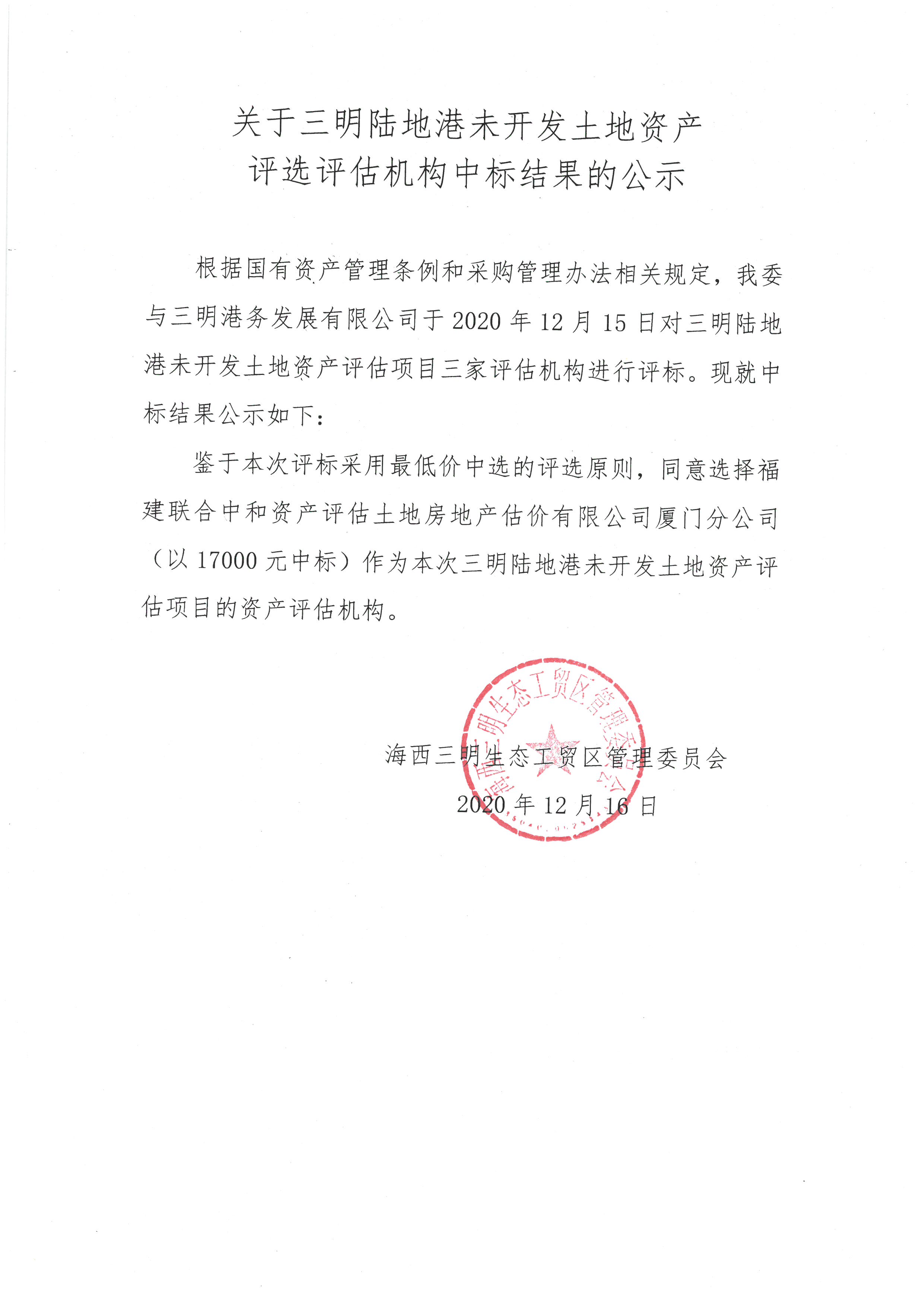 關(guān)于三明陸地港未開發(fā)土地資產(chǎn)評選評估機(jī)構(gòu)中標(biāo)結(jié)果的公示