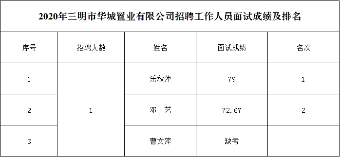 2020年三明市華城置業(yè)有限公司招聘工作人員面試成績及排名