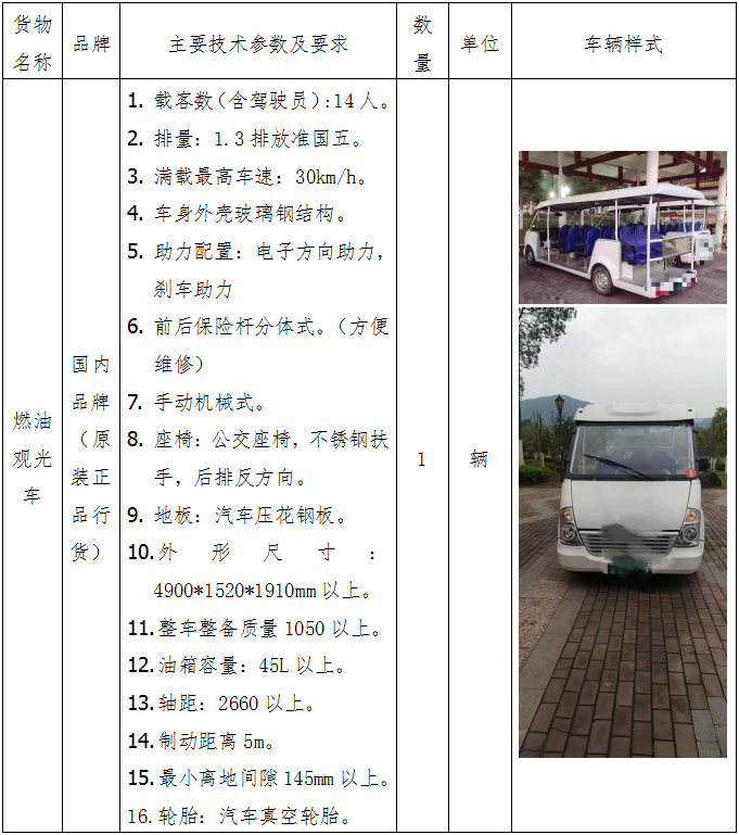 3、質(zhì)量要求:保證所提供的燃油觀光車符合國家規(guī)定的行業(yè)標(biāo)準(zhǔn),并承諾若交貨一周內(nèi)出現(xiàn)質(zhì)量問題負(fù)責(zé)免費退換貨,保證產(chǎn)品質(zhì)量和貨物配置的一致性和完整性,負(fù)責(zé)做好調(diào)試及免費培訓(xùn)等工作。