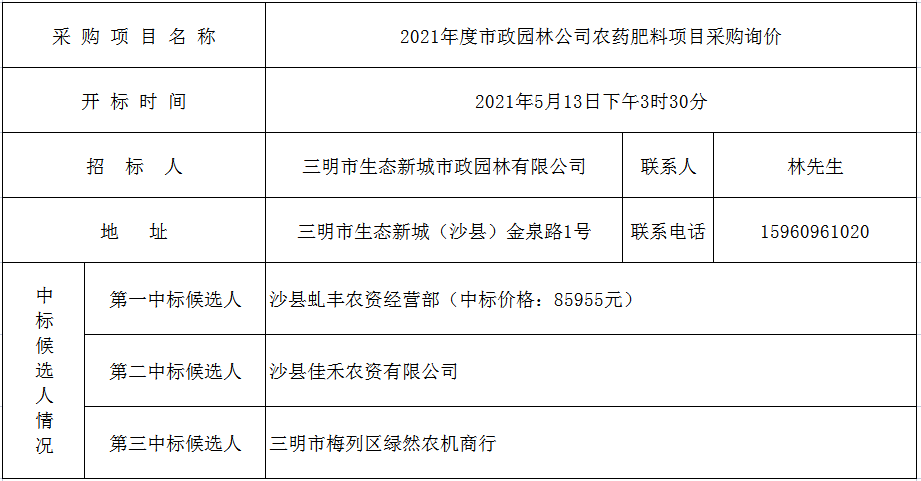 三明市生態(tài)新城市政園林有限公司2021年度農(nóng)藥肥料采購比選中標(biāo)公示