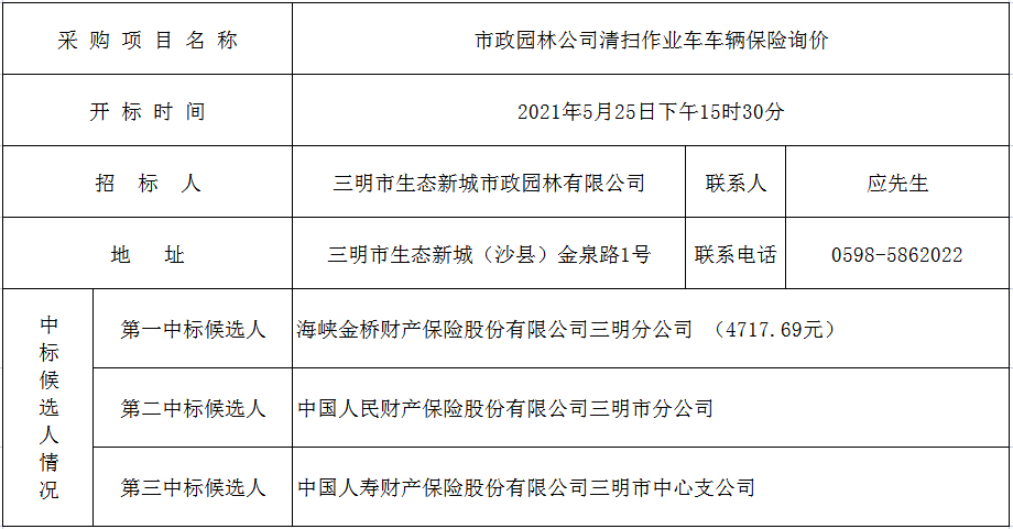 市政園林公司清掃作業(yè)車車輛保險詢價比選結果公示