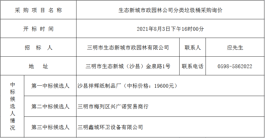 三明市生態(tài)新城市政園林有限公司戶外分類垃圾桶采購比選中標公示