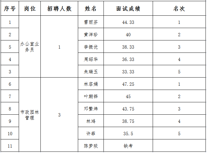 三明市生態(tài)新城市政園林有限公司招聘業(yè)務(wù)骨干面試成績及排名