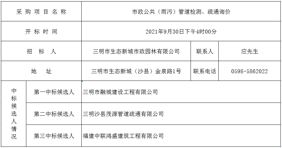 生態(tài)新城市政園林公司市政公共(雨污)管道檢測(cè)、疏通詢價(jià)中標(biāo)公示