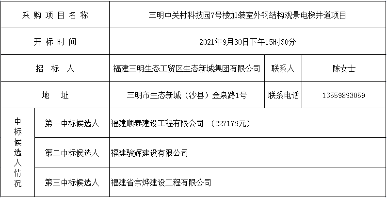 關(guān)于三明中關(guān)村科技園7號(hào)樓室外鋼結(jié)構(gòu)觀景電梯井道項(xiàng)目詢價(jià)比選結(jié)果公示