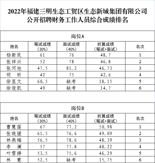 2022年福建三明生態(tài)工貿(mào)區(qū)生態(tài)新城集團(tuán)有限公司公開(kāi)招聘財(cái)務(wù)工作人員綜合成績(jī)排名