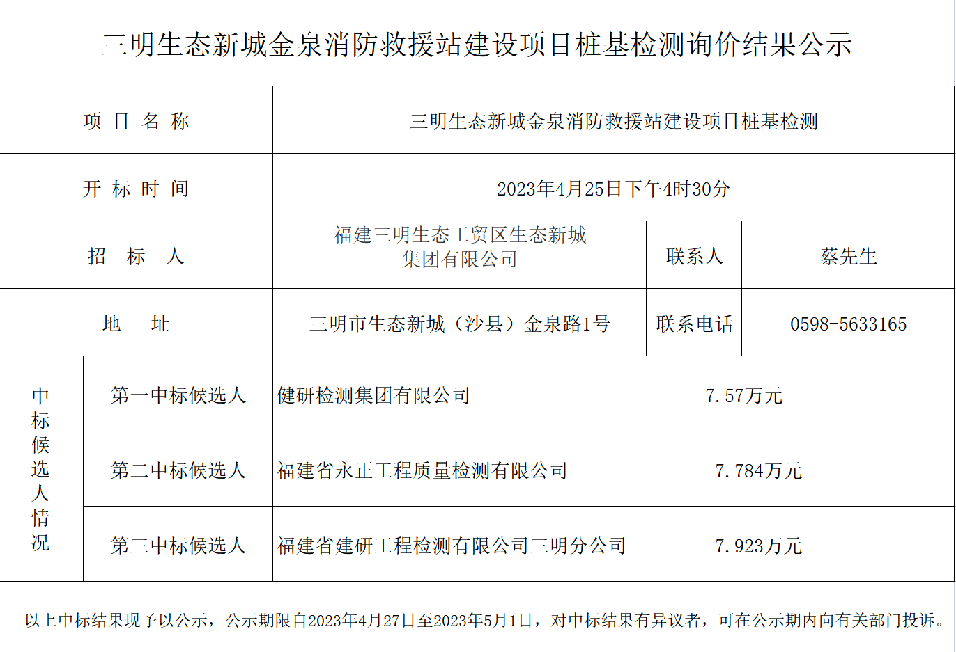 三明生態(tài)新城金泉消防救援站建設(shè)項(xiàng)目樁基檢測(cè)詢價(jià)結(jié)果公示
