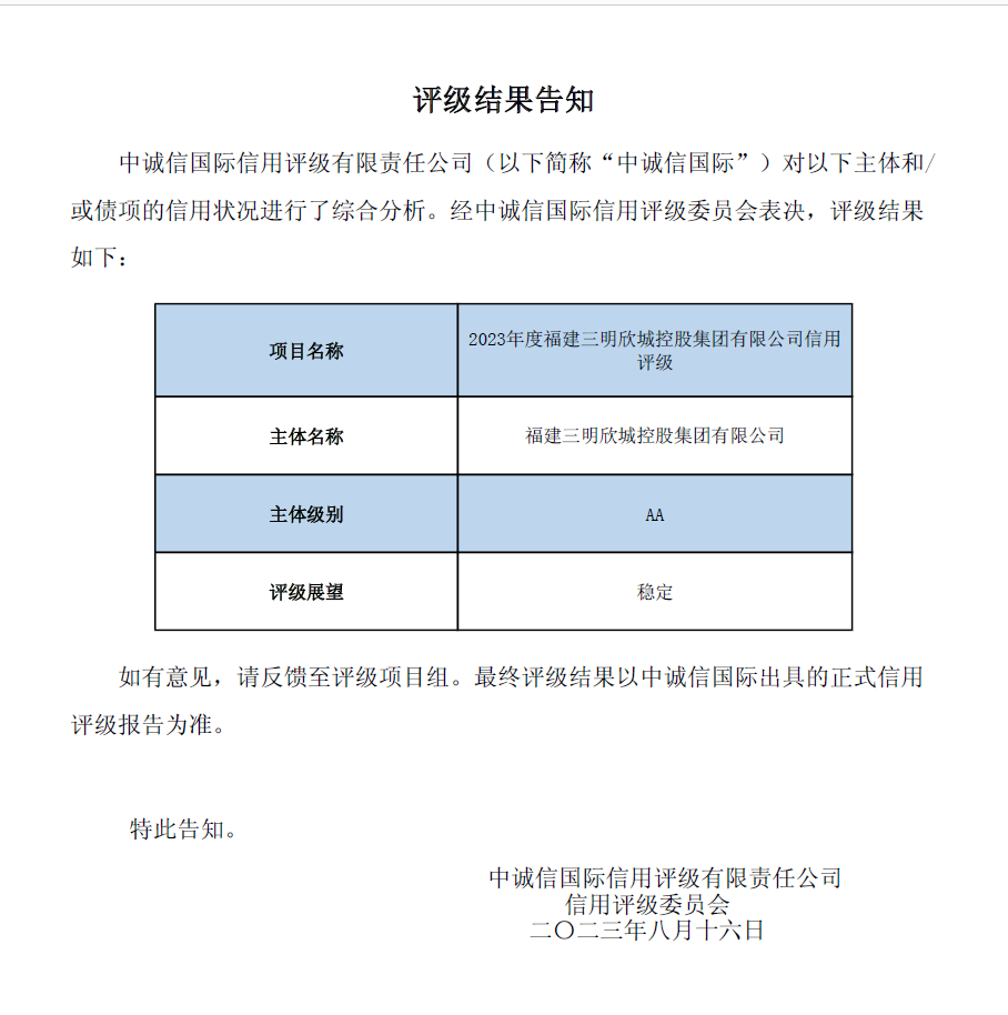 2023年8月18日,經(jīng)中誠(chéng)信國(guó)際信用評(píng)級(jí)有限責(zé)任公司綜合評(píng)定,福建三明欣城控股集團(tuán)有限公司獲評(píng)AA主體信用評(píng)級(jí),評(píng)級(jí)展望為“穩(wěn)定”。