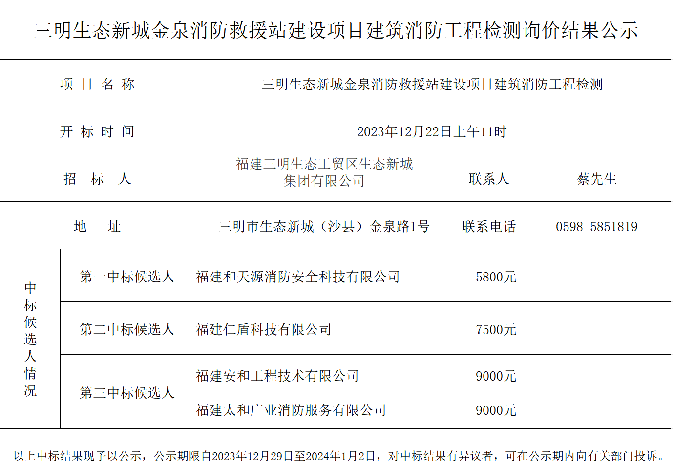 三明生態(tài)新城金泉消防救援站建設項目建筑消防工程檢測詢價結果公示