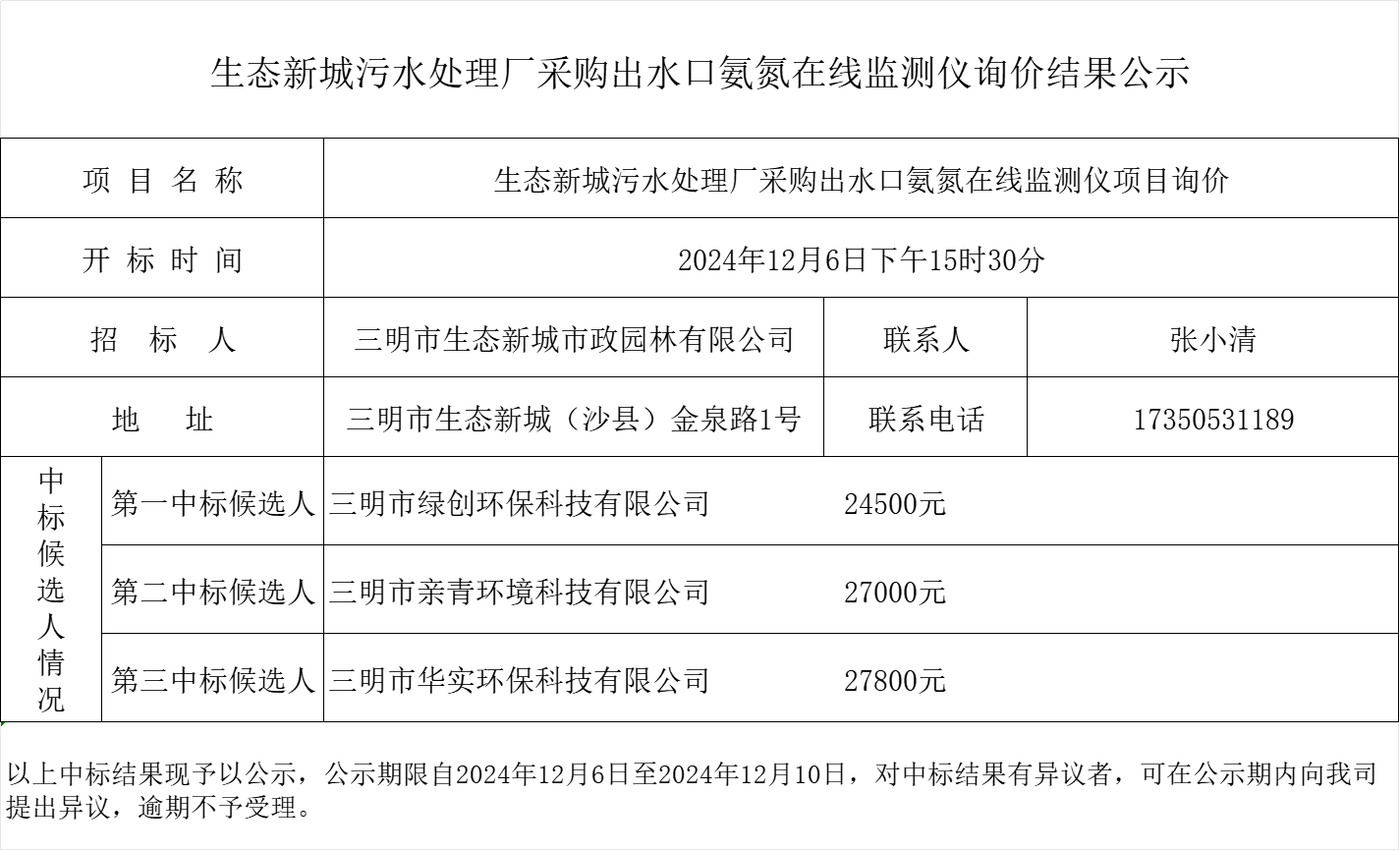 生態(tài)新城污水處理廠采購出水口氨氮在線監(jiān)測儀詢價結(jié)果公示