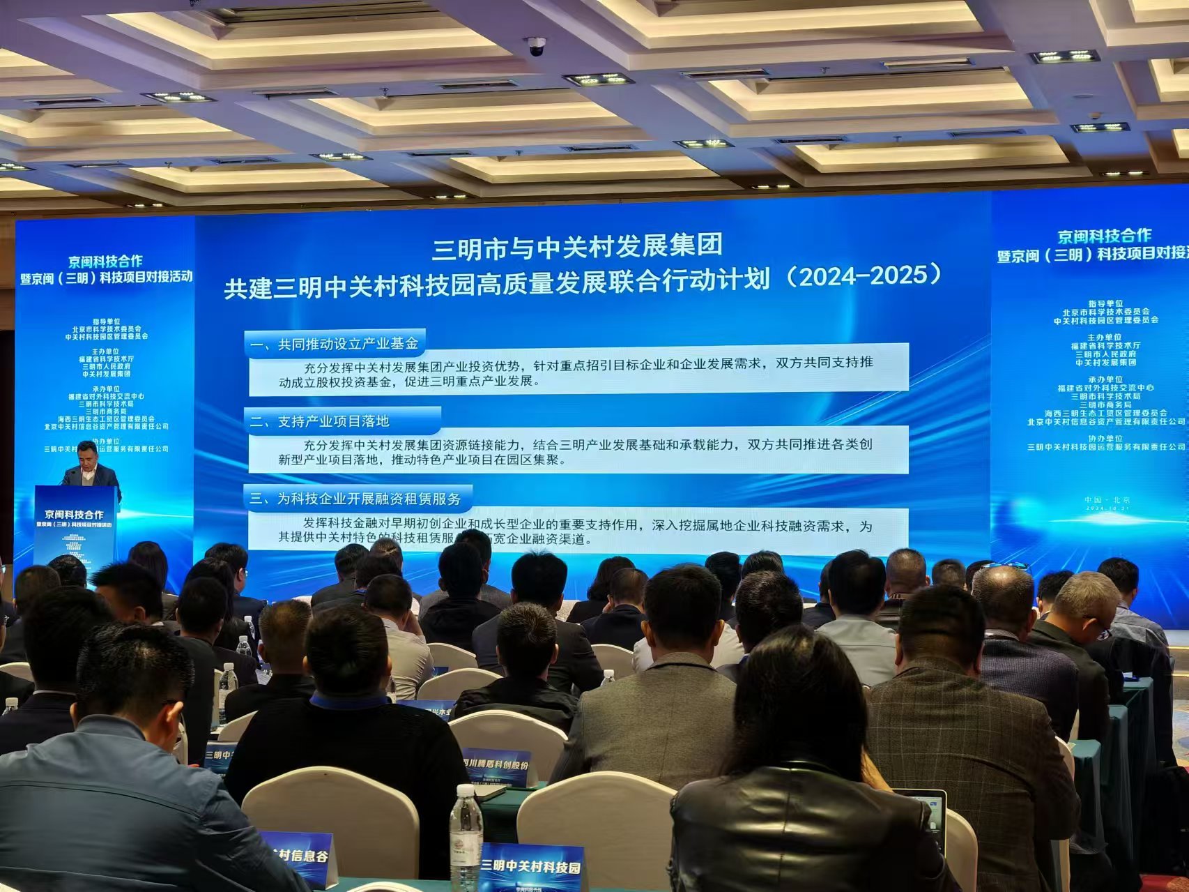2024年10月31日,京閩科技合作暨京閩(三明)科技項(xiàng)目對(duì)接活動(dòng)在北京成功舉辦。會(huì)上,中關(guān)村發(fā)展集團(tuán)與三明市政府聯(lián)合發(fā)布《共建三明中關(guān)村科技園高質(zhì)量發(fā)展聯(lián)合行動(dòng)計(jì)劃》,為三明中關(guān)村科技園發(fā)展提供了強(qiáng)大助力。自聯(lián)合行動(dòng)計(jì)劃發(fā)布以來,集團(tuán)各直屬企業(yè)積極響應(yīng)、靠前擔(dān)當(dāng)、高效推動(dòng),圍繞支持園區(qū)“成立產(chǎn)業(yè)基金、推動(dòng)項(xiàng)目落地、設(shè)立集成服務(wù)中心”等11項(xiàng)重點(diǎn)工作制定具體方案、細(xì)化跟進(jìn)落實(shí),目前,已正式成立三明低空經(jīng)濟(jì)融資租賃中心、三明中關(guān)村科技園集成服務(wù)中心,簽約發(fā)布三明低空經(jīng)濟(jì)產(chǎn)業(yè)投資基金,完成三明中關(guān)村產(chǎn)學(xué)研技術(shù)經(jīng)理人培訓(xùn)平臺(tái)建設(shè)項(xiàng)目簽約,各項(xiàng)工作均取得階段性進(jìn)展。